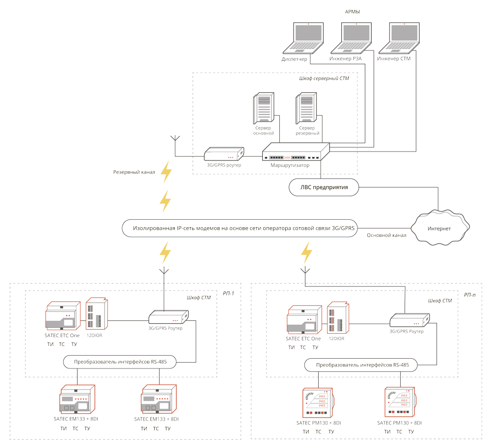Для организации каналов связи между средним и верхним уровнями Системы телемеханики применены 3G/GPRS-роутеры iRZ RU-41. Также 3G/GPRS-роутеры iRZ RU-41 применяется для организации резервного канала передачи на верхнем уровне Системы телемеханики.