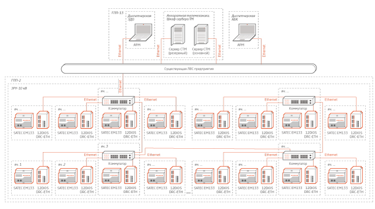 Для сбора телесигнализации положений коммутационных аппаратов 110/35/10 кВ, аварийно-предупредительной телесигнализации, а также для выдачи управляющих воздействий на приводы выключателей ячеек КРУ-35/10 кВ счётчики SATEC EM133-5-50Hz-H-ACDC-870 дополнительно оснащены модулями дискретного ввода/вывода 12DIOS-DRC(250V)-ETH. Таким образом, прибор с модулем представляет собой контроллер присоединения с функциями сбора телеизмерений, телесигнализации, телеуправления, а также учёта электрической энергии.