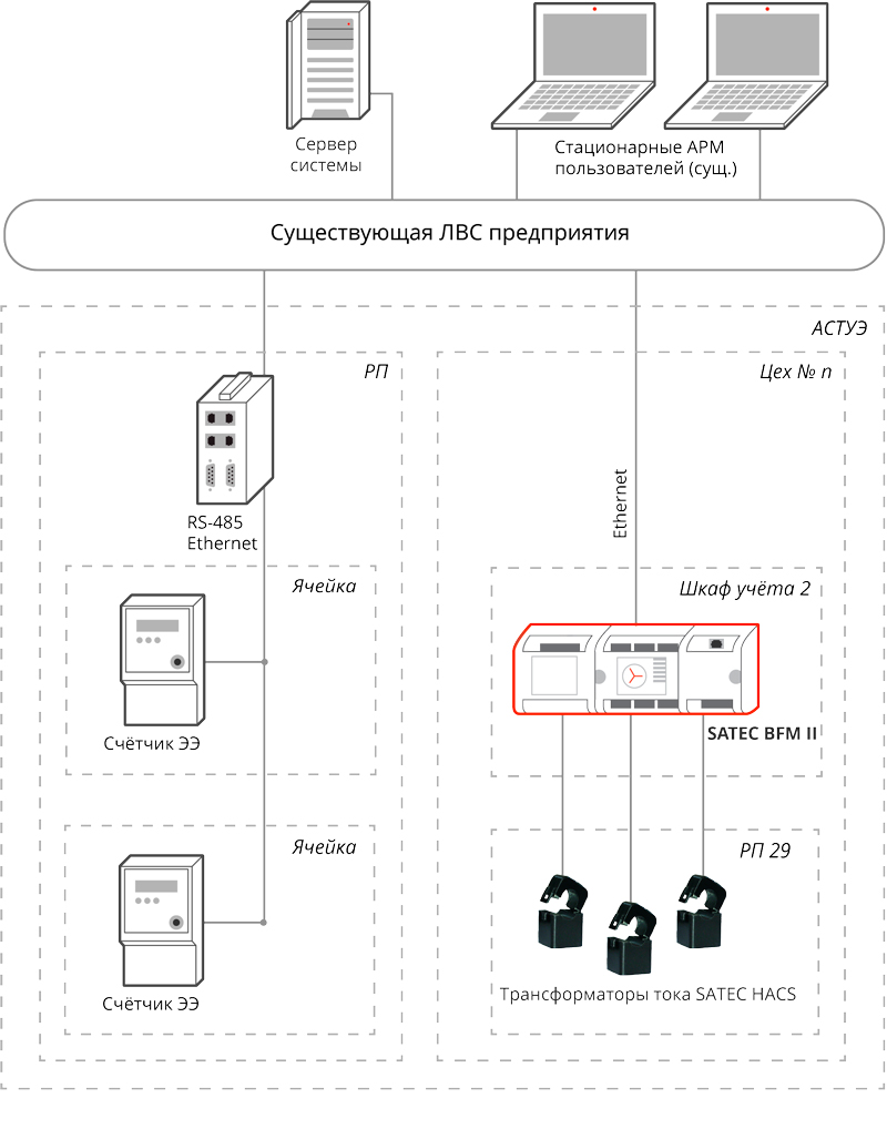 Подключение счётчиков BFM II к измеряемым цепям контролируемых присоединений выполняется при помощи трансформаторов тока SATEC HACS, поставляемых вместе с приборами учёта.