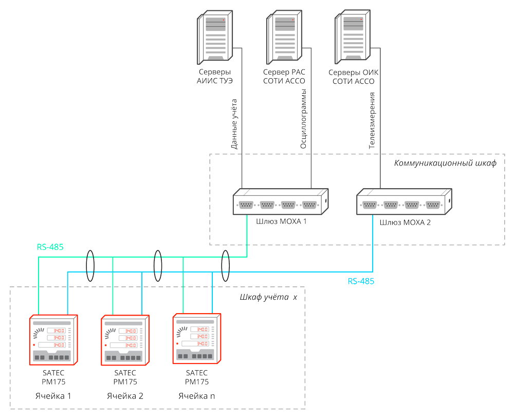Магистрали RS-485, используемые для передачи информации на серверы АИИС ТУЭ, сервер РАС СОТИ АССО и на серверы ОИК СОТИ АССО, выполнены разными парами жил в одном кабеле.